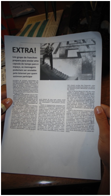Cena 3: O jornal ressalva uma matéria: “Grupo de franceses preparam uma cápsula do tempo, para enviar ao espaço. As mensagens devem ser enviadas, pela internet, por quem quiser participar.”